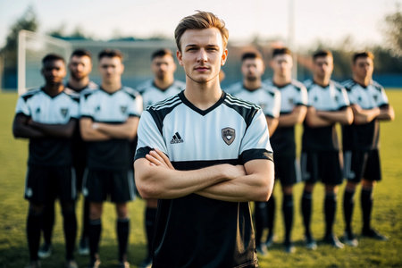 A young manager stands in front of his team, arms crossed, as they gather for a training session at a lush green sports field on a bright sunny day