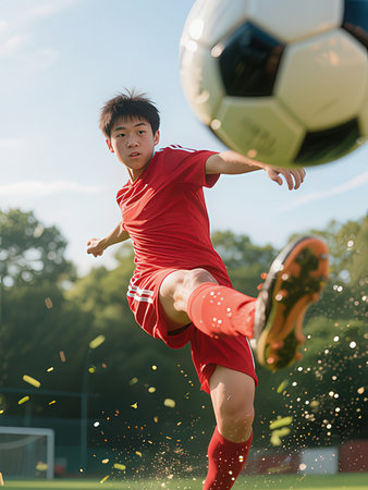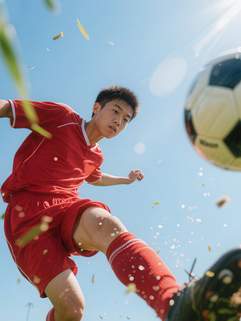 young asian soccer player kicking the ball in the blue sky background