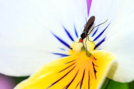 Close up of an Heartsease Viola tricolor flower in summer, with a small red-eyed dagger fly on it