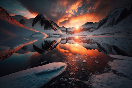 dramatic sunset over a frozen lake in the heart of a snowy mountain range., created with generative ai