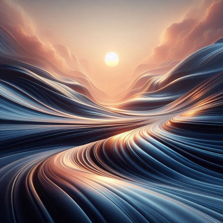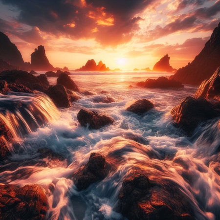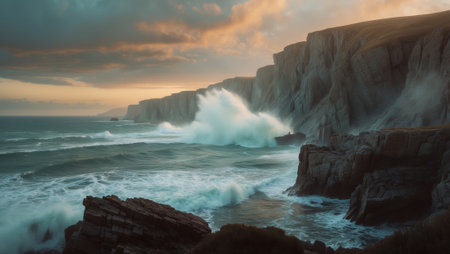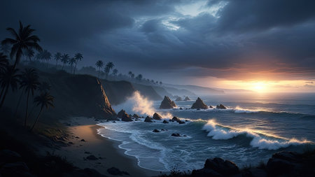 This image presents a coastal landscape featuring ocean waves crashing against rocky shores. The composition showcases a sunset with vibrant hues illuminating the water. The scene uses a painterly style with moody lighting and dark, atmospheric tones. Suitable for various uses including editorial and commercial projects.