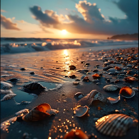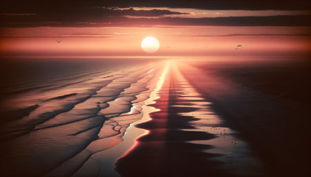 A serene beach at sunset with birds flying and waves reflecting the sun's glow. The image captures the tranquil beauty of dusk.