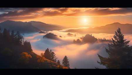 A captivating scene showcasing a group of hikers in misty mountains. The stunning landscape combines adventure and nature, presenting a moment of exploration and connection with the wilderness.