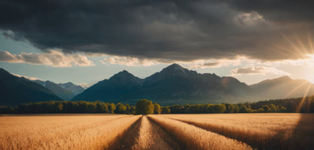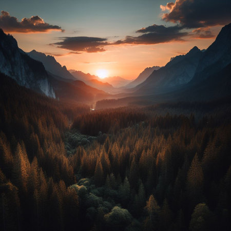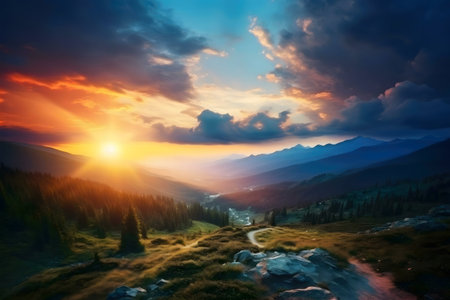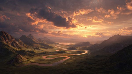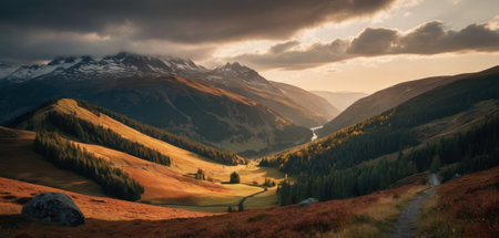 Breathtaking sunset painting the sky with vibrant colors over majestic mountains. A tranquil valley, and winding path add to the scene's beauty.