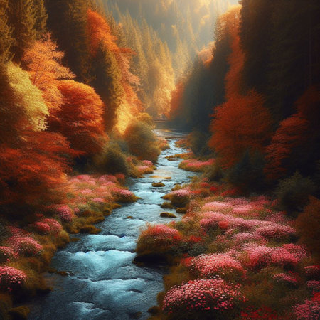 Beautiful fantasy landscape with autumn forest and river. Digital painting.