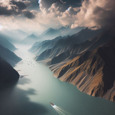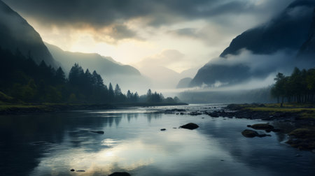 a stunning sunrise over a picturesque inlet, captured in ultra high resolution photography. the mountains are adorned with clouds, creating a mesmerizing scene with ethereal godrays piercing through the morning mist. this magical and epic atmosphere is beautifully portrayed in this wide angle shot taken with a hasselblad camera. ai generated