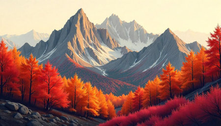 Autumn landscape with vibrant foliage and snow-capped mountains
