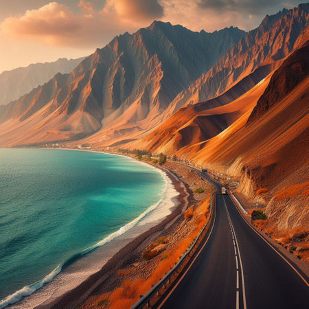 Road on the sea coast at sunset. Landscape with mountains and ocean.