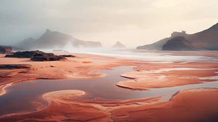 a stunning photo of a beach near a vast ocean and rocky terrain, resembling a mysterious jungle. the image showcases a captivating blend of dark orange and light emerald hues. captured using vray tracing and kodak plus-x, this contest-winning photograph is truly breathtaking. with its astonishing beauty, it's hard to believe this image is in 32k uhd resolution. ai generated