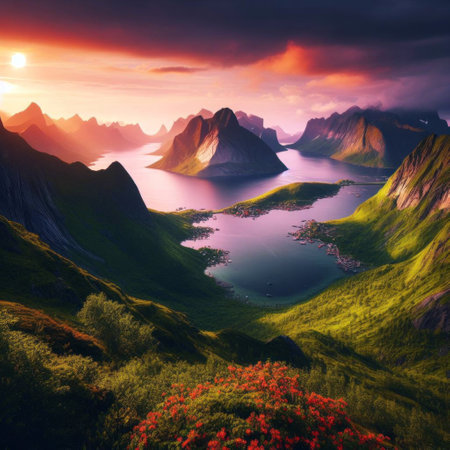 Stunning fjord view surrounded by mountains and lush greenery at sunrise