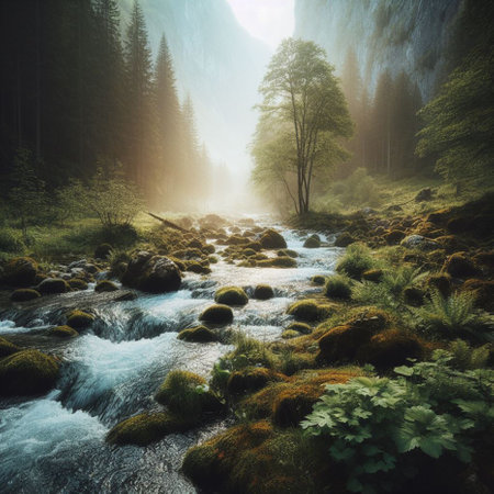 Mountain river in the misty forest. Filtered image processed vintage effect.
