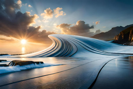 a stunning rocky mountain landscape featuring a lake in the background, showcasing a futuristic sci-fi aesthetic. the photo captures the beauty of light beige and amber tones, inspired by marine biology. this 8k 3d image by scarlett hooft graafland portrays lively coastal landscapes with a matte finish. ai generated
