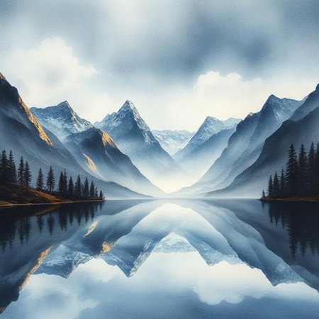 Mountains reflected in a lake, 3d digitally rendered illustration.