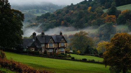 A Classic English countryside manor with rolling hills and mist