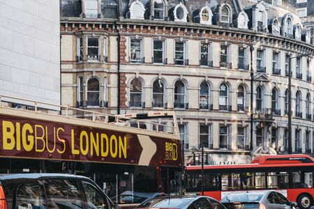 London, UK - July 15, 2019: People on the upper deck of Big Bus open top tour bus in Central London, selective focus, buildings on background. London is one of the most visited cities in the world.