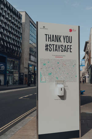 London, UK - June 13, 2020: Hand sanitising station and map of sanitiser locations on empty New Oxford Street, a famous and typically busy shopping street in London, UK.