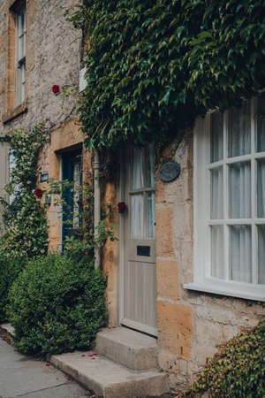 Stow-on-the-Wold, UK - July 10, 2020: Front of a house, partially covered with wall climbing plants in Stow-on-the-Wold, a market town in Cotswolds, UK, built on Roman Fosse Way.