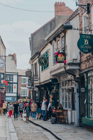 York, UK - June 22, 2021: Row of shops on The Shambles, an old street in York, England, with overhanging timber-framed buildings, some dating back as far as the fourteenth century.