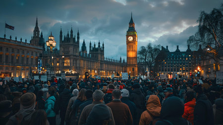 Bustling crowd at dusk by big ben in London, showcasing travel allure and lively urban vibes. A.I.