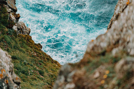 An aerial shot of the sea showing between the cliffs of the mountain with a crystal clear water