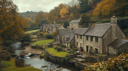 A picturesque village nestled in a valley, with stone cottages and a river running through it
