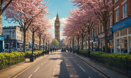 A street in London lined with cherry blossom trees, with Big Ben in the distance