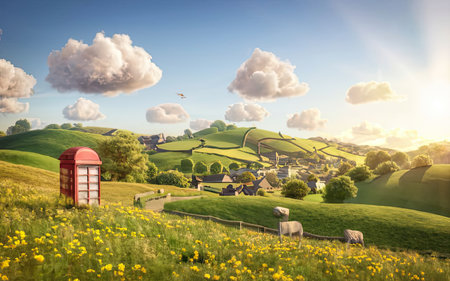 A serene countryside landscape with rolling hills, green fields, and a small village under a blue sky