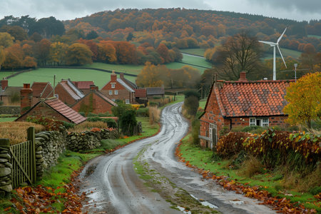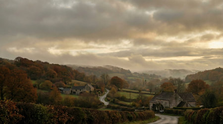 Scenic Rural Road Winding Through Autumn-Foliaged Landscape in Early Evening Near Small Village