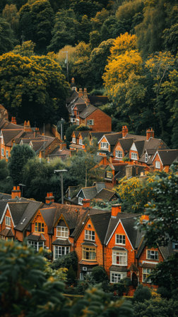 A picturesque lane meanders through an idyllic English village, lined with charming thatched cottages and vibrant, blooming gardens at sunset. Resplendent.