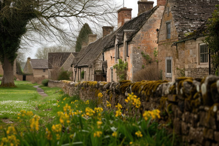 A row of historic stone houses stands next to a lush green field, creating a picturesque scene, Quaint farmhouses in a peaceful rural village, AI Generated