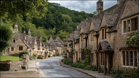 Charming stone cottages sit peacefully along a winding road embraced by vibrant nature.