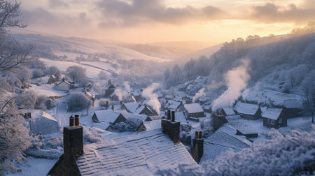 A snowy village nestled in a valley at sunrise