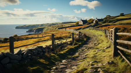 an old stone fence, reminiscent of traditional british landscapes, stands in the foreground. the lens flare adds a touch of warmth to the lively coastal landscape. the dark teal and light orange hues create a captivating contrast. this vernacular architecture captures the charm of idyllic rural scenes, perfect for those who appreciate the cozy and rustic cabincore aesthetic. ai generated