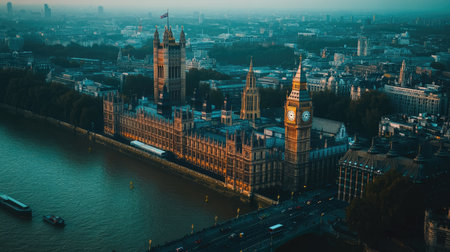 Aerial shot of Big Ben and the Houses of Parliament in London, with copy space available.