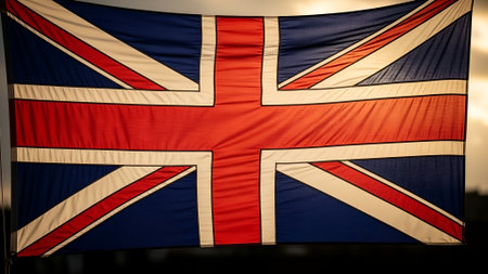 British flag fluttering in the wind with warm sunset backlighting creating a vibrant and patriotic atmosphere suitable for national and cultural marketing campaigns.