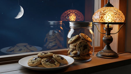 A plate of cookies and a jar of cookies sit on a wooden table next to a lamp during ramadhan.