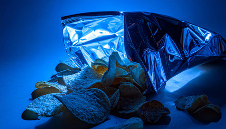 An open shiny silver bag of potato chips spilling out onto a blue surface with dramatic lighting and shadows.