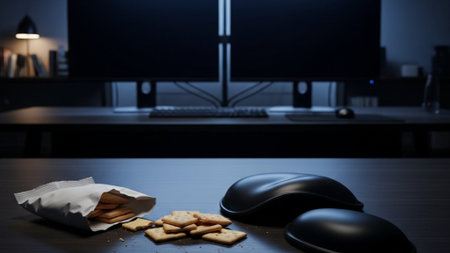 A cinematic, ultrawide 16:9 environmental view of a stark, late-night professional desk setup. The s