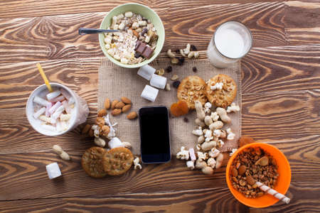 Snacks mix frame top view. Nuts and dried fruits with crackers, copy space