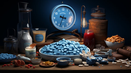 Generative AI : Happy Shavuot festive card Jewish religious holiday concept Dairy products fresh apples cheese bread milk cottage cheese wheat and honey on dark blue wooden backgro