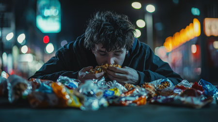 A young man is crouched over a pile of food wrappers at night, savoring a late night snack in a lively city environment with bright lights and busy streets.