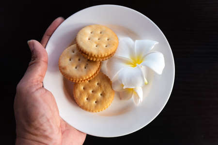 Flavoured biscuits on a plate with a chocolate biscuit on a white background