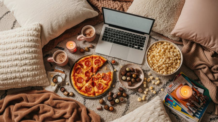 Relaxing evening setup with delicious pizza, tasty popcorn, and a laptop. Enjoying comfortable blankets and plush pillows for ultimate comfort.