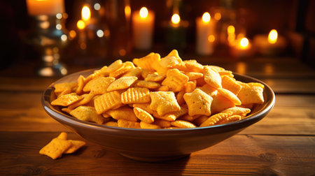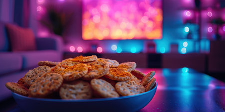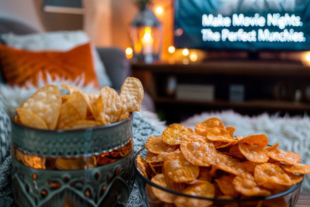 A comfortable movie night scene features a bowl of crispy chips, setting a relaxed atmosphere. The warm glow of a candle adds to the inviting ambiance for a perfect evening in