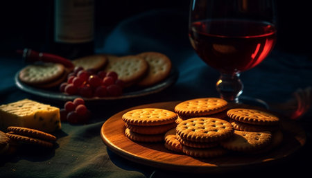 Homemade dessert table with baked bread, biscuit, and chocolate chip cookie generated by artificial intelligence