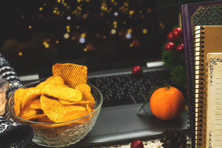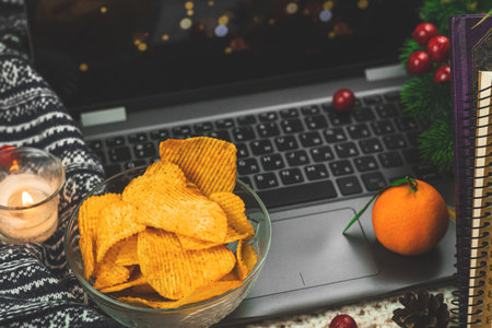 Cozy winter and autumn warm nights with movie watch and unhealthy food, potato chips in bowl, knitted sweater close up