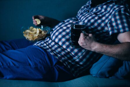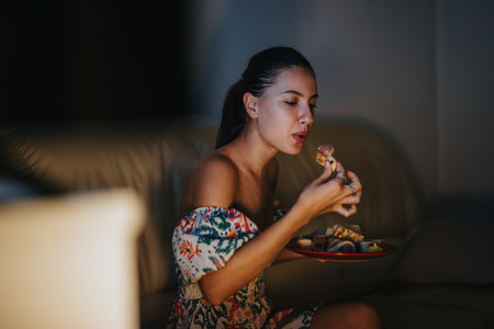 Emotional eating, mental disorder, depression, loneliness, stress. Lonely woman eating sweets and watching tv late in the night. Nerve food
