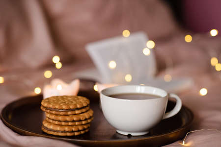 Cup of fresh black tea with stack of biscuits with chocolate filling on tray with burning candles and open paper book in bed over glow lights. Cozy home atmosphere.