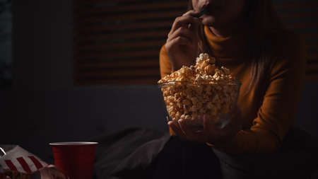 Young woman enjoy eating popcorn and watching movie at night. Entertainment and leisure activity concept.