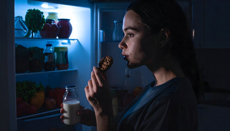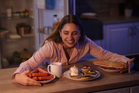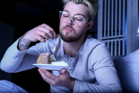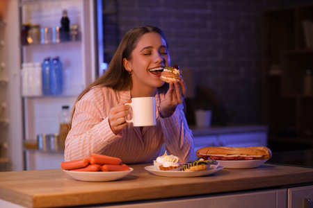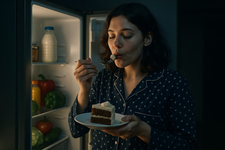 Young woman enjoying a midnight cake snack in the kitchen with refrigerator light illuminating the scene. concept of late-night craving, sweet indulgence, relaxation.
